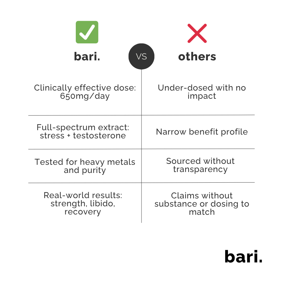 Bari’s Ashwagandha 650mg is your natural stress shield — designed to help you stay calm under pressure, recover faster, and keep your testosterone levels optimized.