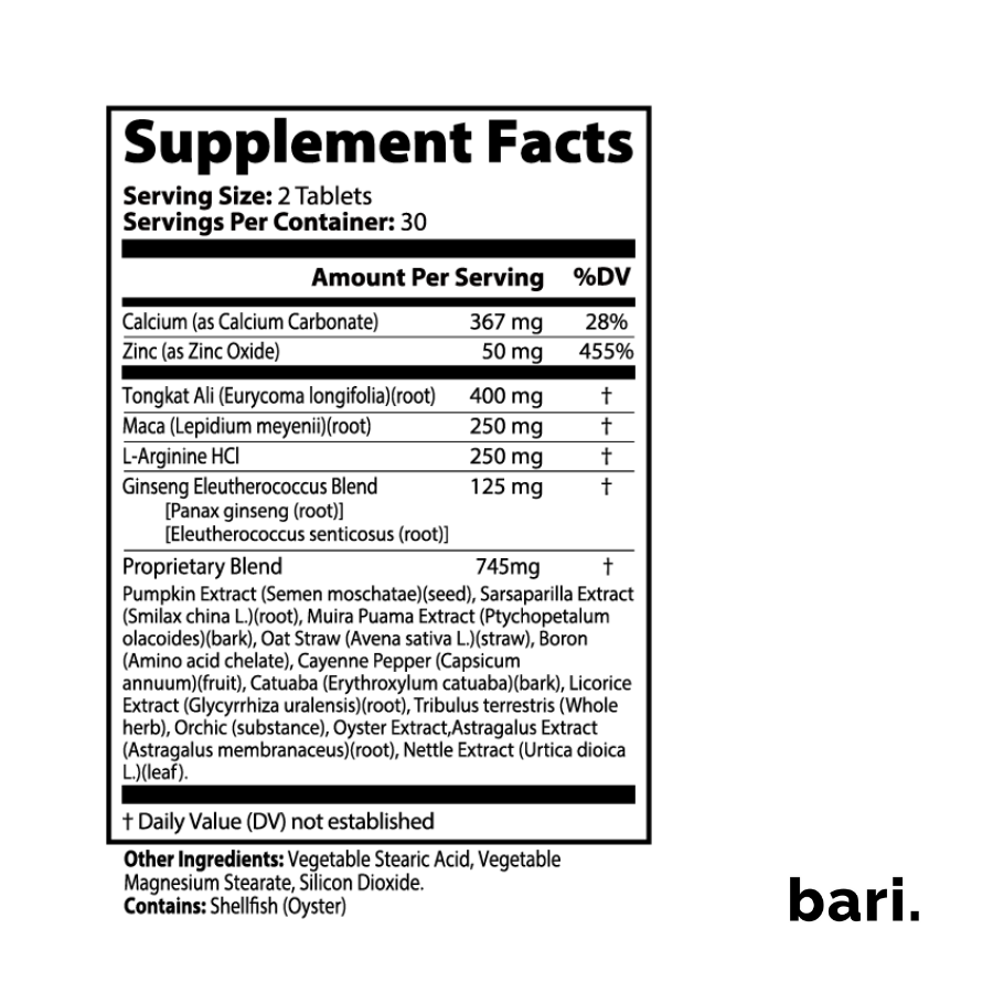 Ingredients: Calcium (as Calcium Carbonate), Zinc (as Zinc Oxide), Tongkat Ali root, Maca root, L-Arginine HCL, Ginseng Eleutherococcus Blend (Panax Ginseng, Eleutherococcus Senticosus), Proprietary Blend (Pumpkin Extract, Sarsaparilla Extract, Muira Puama Extract, Oat Straw, Boron, Cayenne Pepper, Catuaba, Licorice Extract, Tribulus Terrestris, Orchic, Oyster Extract, Astragalus Extract, Nettle Extract), Vegetable Stearic Acid, Vegetable Magnesium Stearate, Silicon Dioxide.