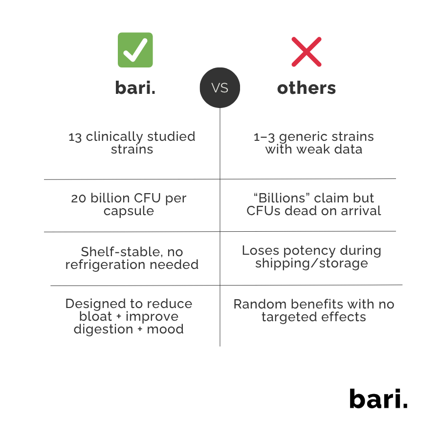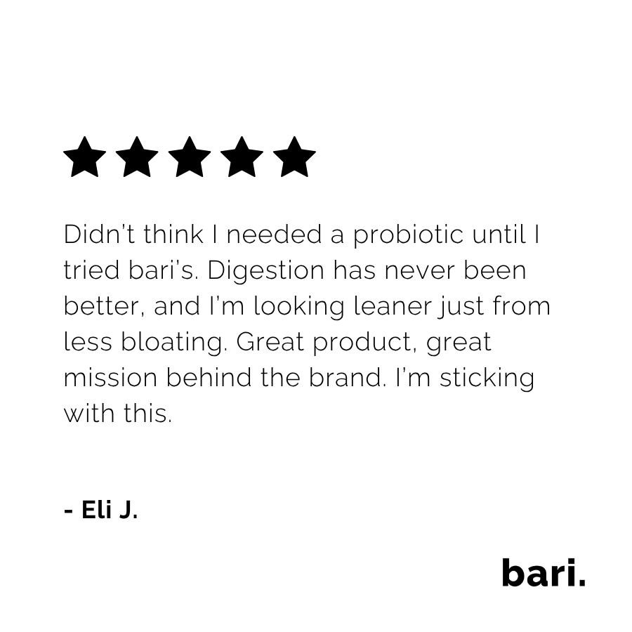 Bari’s Probiotic 20B CFU supports healthy digestion, improved nutrient absorption, and bloat control — all critical for building muscle, reducing fat, and keeping your mind and body locked in. Because real performance starts in the gut.*